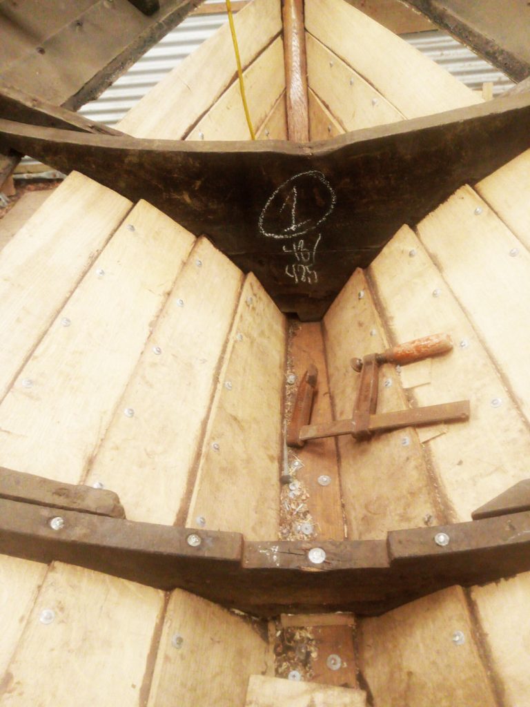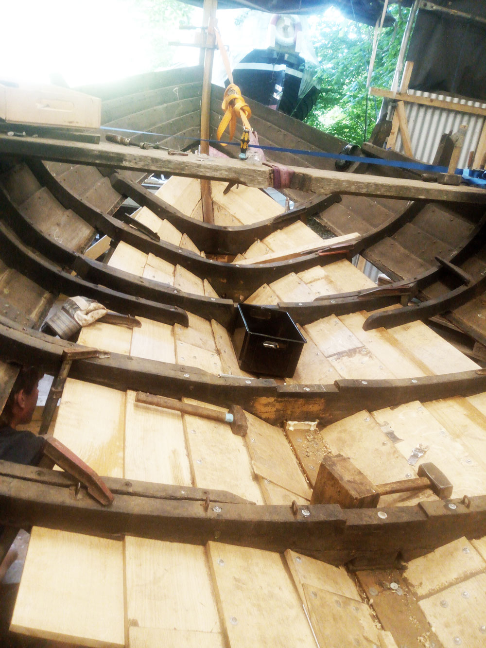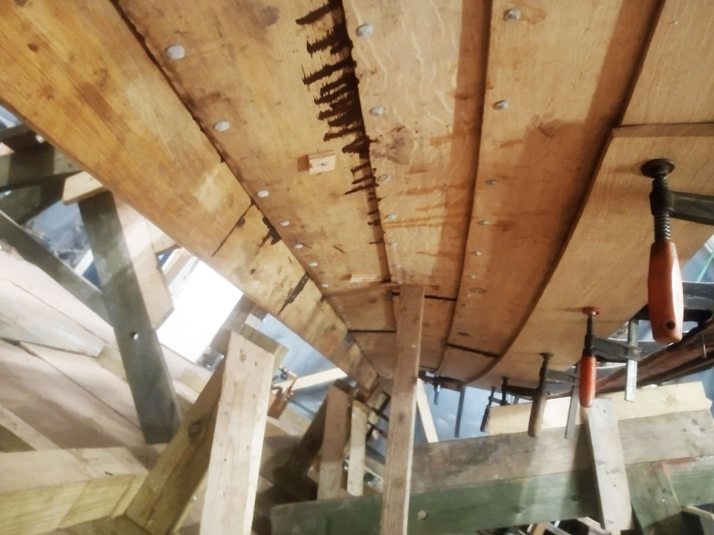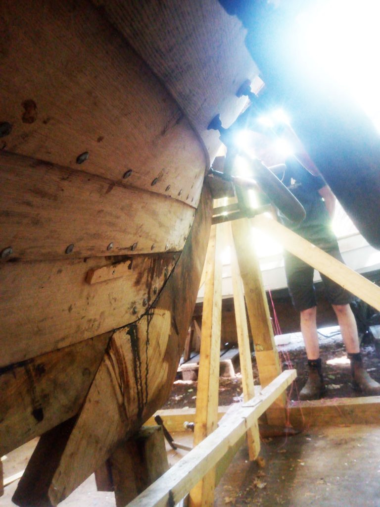 SAGAs bund er udskiftet med nye egebord. Bådebyggerne arbejder sig stille og roligt opad !